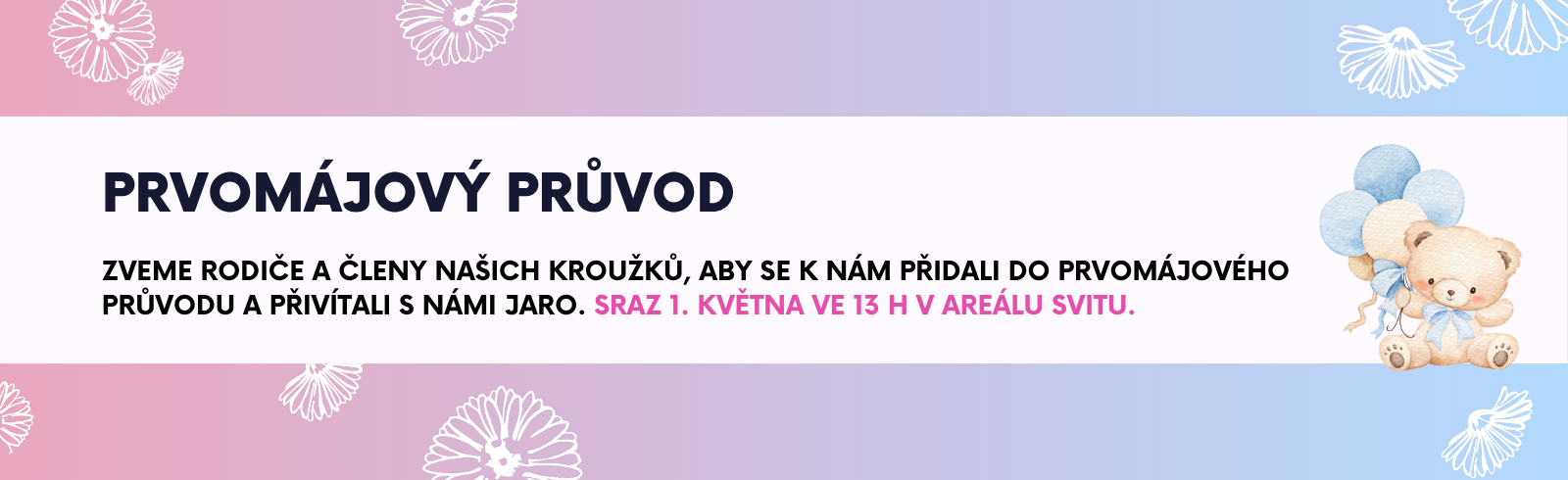Prvomájový průvod - reprezentaci DDM Astra, Zlín. Do průvodu zveme všechny externí pracovníky DDM Astra i všecny děti, které navštěvují naše kroužky s rodiči i bez. Přijďte si s námi projít Zlínem v příjemné a veselé atmosféře prvomájového průvodu. Start na ulici u kavárny Továrna v areálu Svit, zakončení průvodu na náměstí míru. Budeme se na Vás těšit. Zájemce prosíme o registraci.