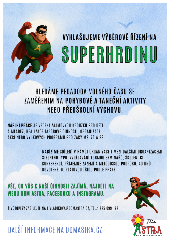 Možná jste to právě vy. Někdo, kdo se nebojí práce, má rád děti a mládež a vidí v práci ní smysl. Někdo, kdo věří, že pohyb, tvoření a objevování mohou dětem a mladým lidem změnit svět. A někdo, kdo má chuť být u toho.
