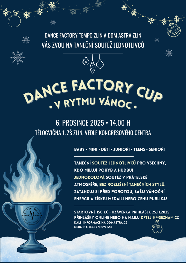 Taneční soutěž "V rytmu Vánoc" je hobby soutěž jednotlivců, kterou pořádá Dům dětí a mládeže Astra Zlín a taneční škola Dance Factory Tempo. Akce se uskuteční v sobotu 6. prosince 2025 od 14.00 hodin v tělocvičně 1. ZŠ Zlín na ulici Univerzitní (vedle Kongresového centra).